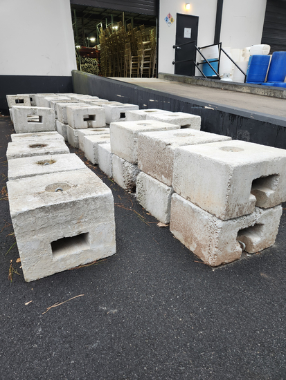 If your tent cannot be staked into the ground to secure it, we have to use weights to anchor the tent. These 500 pound concrete blocks can be used on smaller tents such as 20 foot wide tents. Each tent will require one block per tent leg. ( More than one weight per leg may be required depending on the conditions of the site. )more ➔